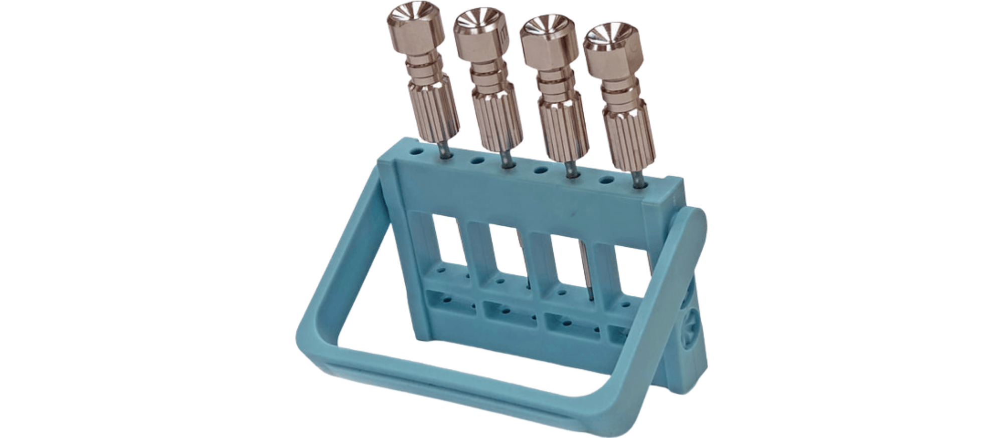 This Bur Block has 8-Holes for each HP 2.35mm or FG 1.60mm Shank Carbide Burs with a Rotating kick stand. It can also hold IT-Drivers.