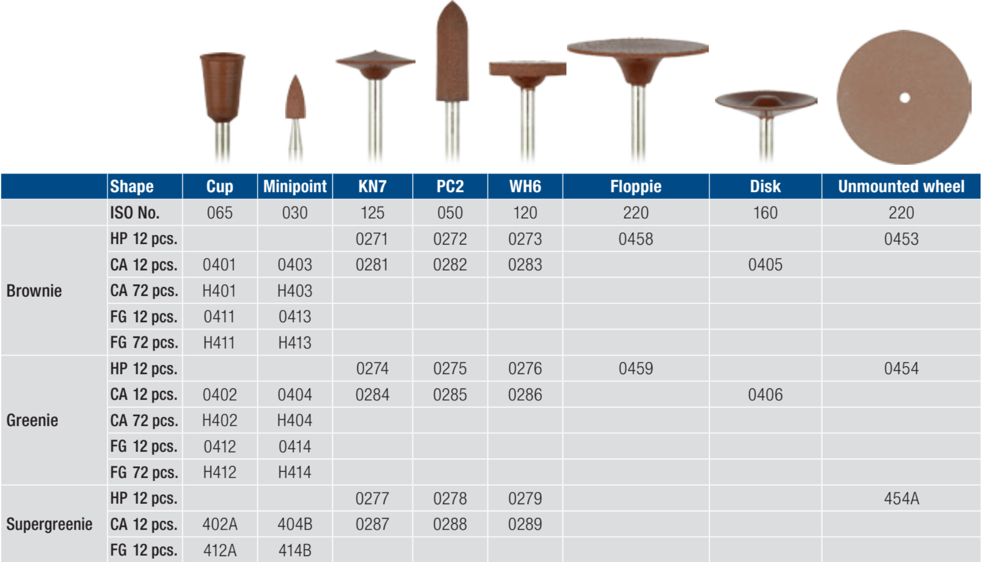 Brownies, Greenies and Supergreenies are autoclavable or can be disinfected in cold sterilization and doesn’t require any polishing paste or pumice
