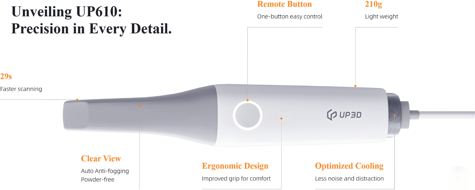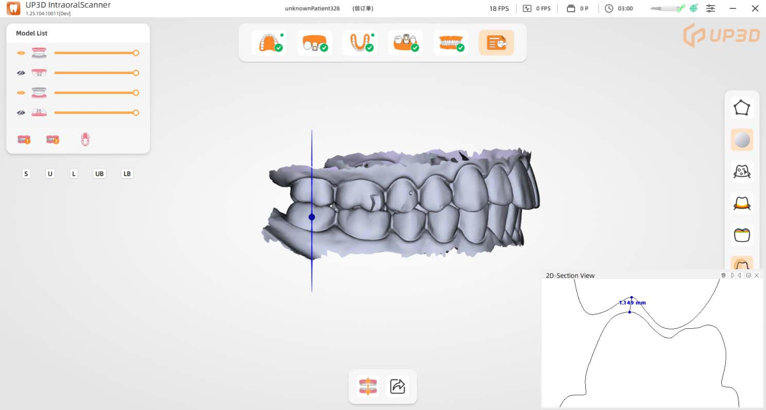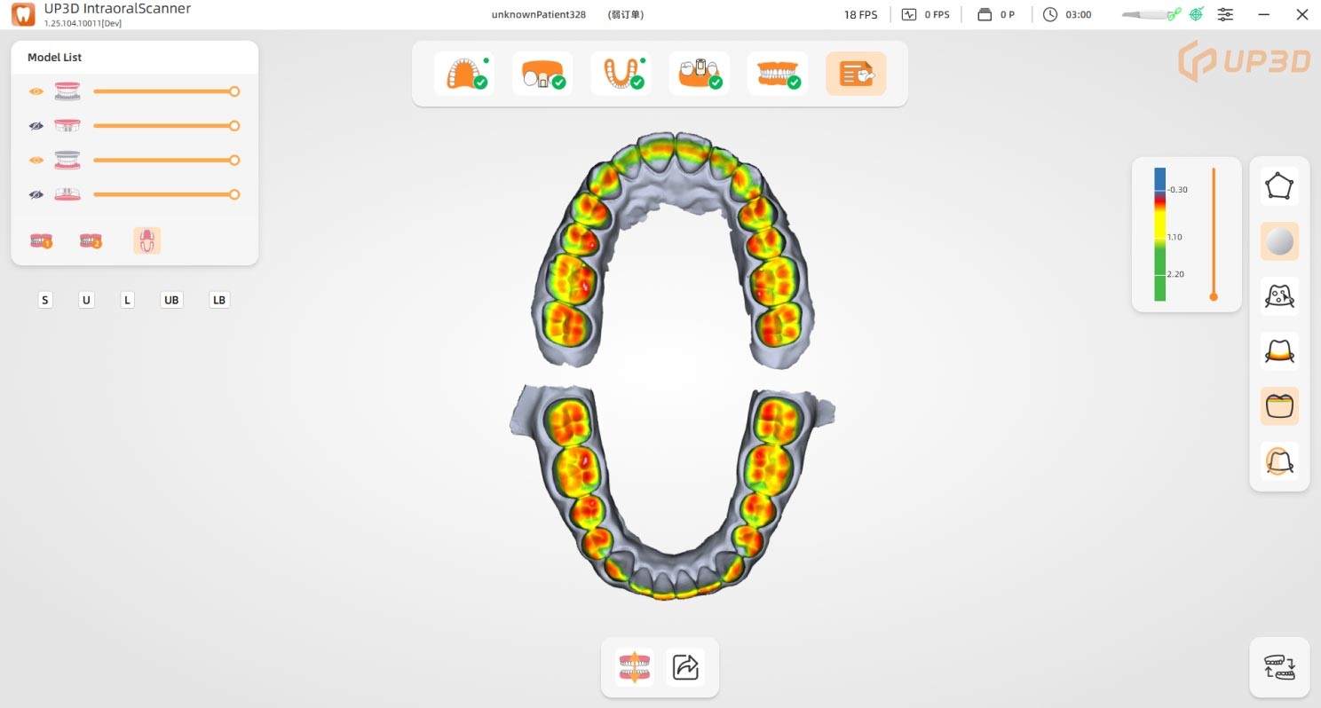 The UP610 delivers precision and versatility with its 27±3mm ultra-deep scan depth. Perfect for a variety of clinical scenarios, including capturing scan bodies and periodontal details, it ensures accurate, reliable results with ease.