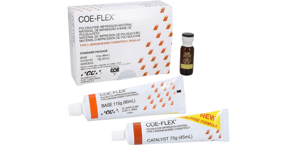 Coe-Flex® is a lead-free, all-purpose rubber base impression material for inlays, crowns, bridges, full and partial dentures, rebasing and relining. In more than 25 years of clinical practice, Coe-Flex® has offered consistently detailed and precise impressions.