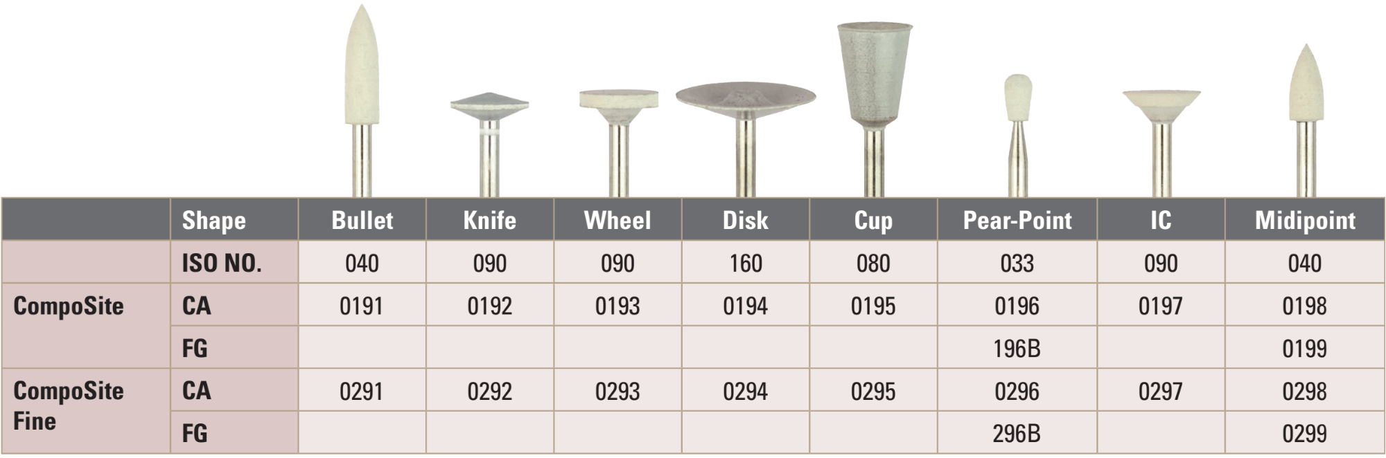 CompoSite instruments are designed for a perfect finish of CompoSite restorations without scratching the surrounding enamel. CompoSite POLISHERS are used for finishing and prepolishing, CompoSite Fine (with white banded shank) for Polishing. The flexible and adaptable cups and disks will polish subgingival and interproximal surfaces safely while pear points and midipoints are recommended for the polish of occlusal and lingual surfaces.