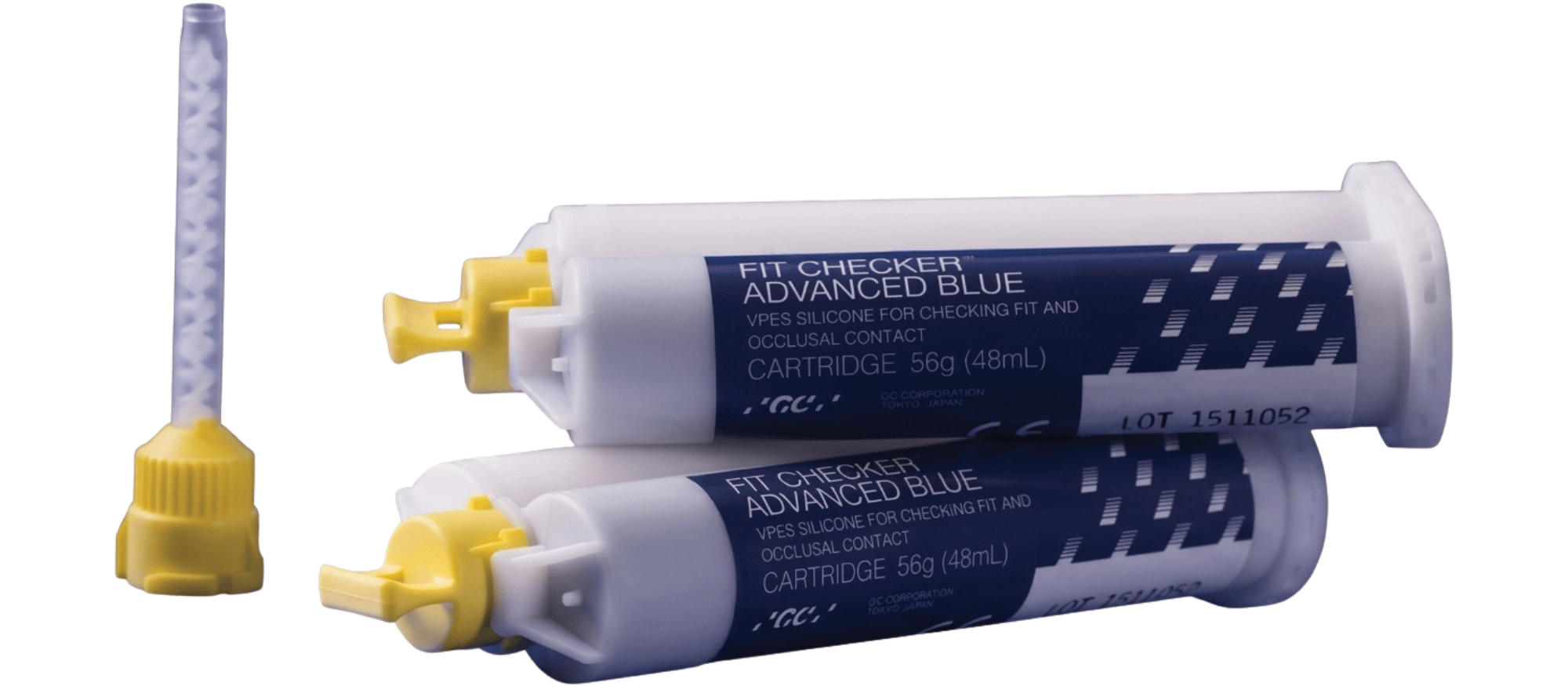 Fit Checker™ ADVANCED and Fit Checker™ ADVANCED BLUE are Vinyl Polyether Silicone (VPES™) materials that are ideal for fit-checking dentures, PFM (Porcelain-Fused-to-Metal) Restorations, ceramic prosthetics and occlusal Contact (Fit Checker™ ADVANCED is ideal for fit-checking dentures and PFM Restorations; Fit Checker™ ADVANCED BLUE is ideal for fit-checking ceramic prosthetics and occlusal Contact).