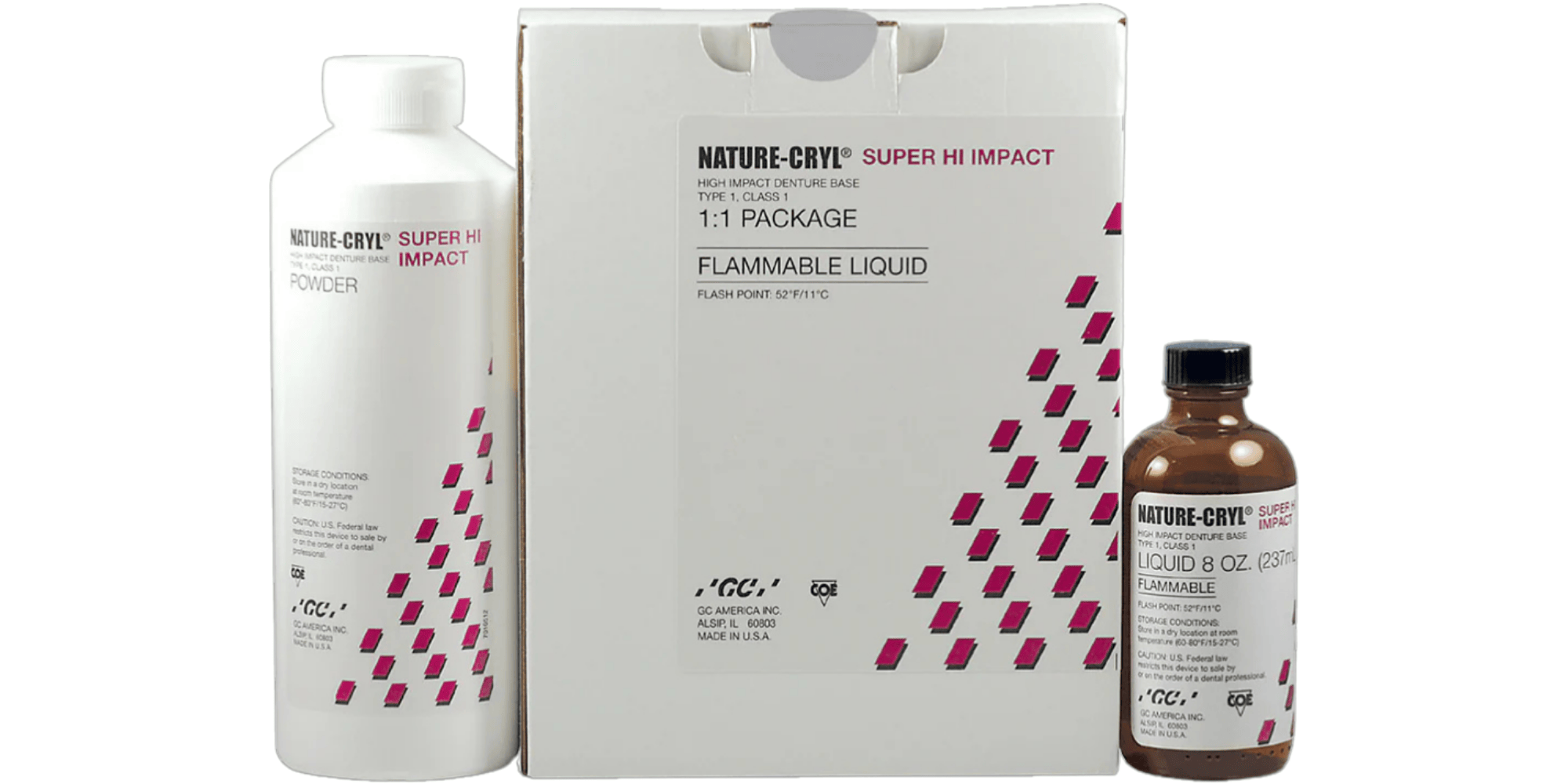 NATURE-CRYL® Super HI Impact is an ultra high-Impact denture base material. It has superior Impact strength that exceeds all of the requirements of Type 1 Class 1 denture based resins on the market today. This product is cadmium-free and offers up to 20-minutes of working time. NATURE-CRYL® Super HI Impact resists breakage, is easily finished and polished, has convenient 2-hr heating cure and/or overnight cure and has superior physical properties.