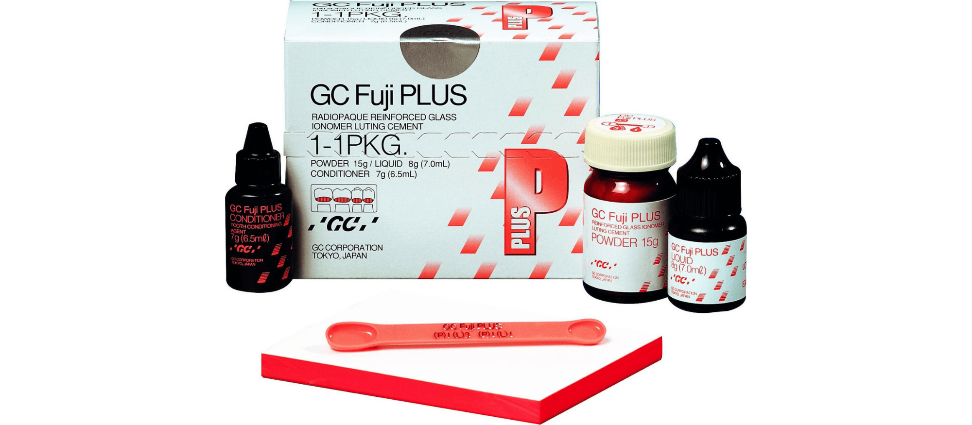 GC Fuji PLUS® Powder Liquid 1:1:1 Kit: 1 (15 g) bottle of powder, 1 (7 mL) bottle of liquid, 1 (6.5 mL) GC Fuji PLUS® CONDITIONER, 1 mixing pad and 1 scoop. - # 431011