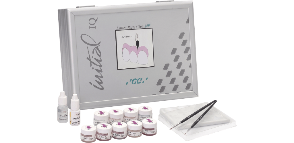 GC Initial® IQ Lustre Pastes NF Gum, Shades Kit (1 x 4g each of: G-23, G-24, G-34/G-35, G-36 1 x 3 g each of: LP-M1, LP-M2, LP-M3, LP-M4, Diluting Liquid, Refresh Liquid, 1 mixing dish, 2 brushes, 1 plastic cover, 1 Color chart, 1 technical manual)