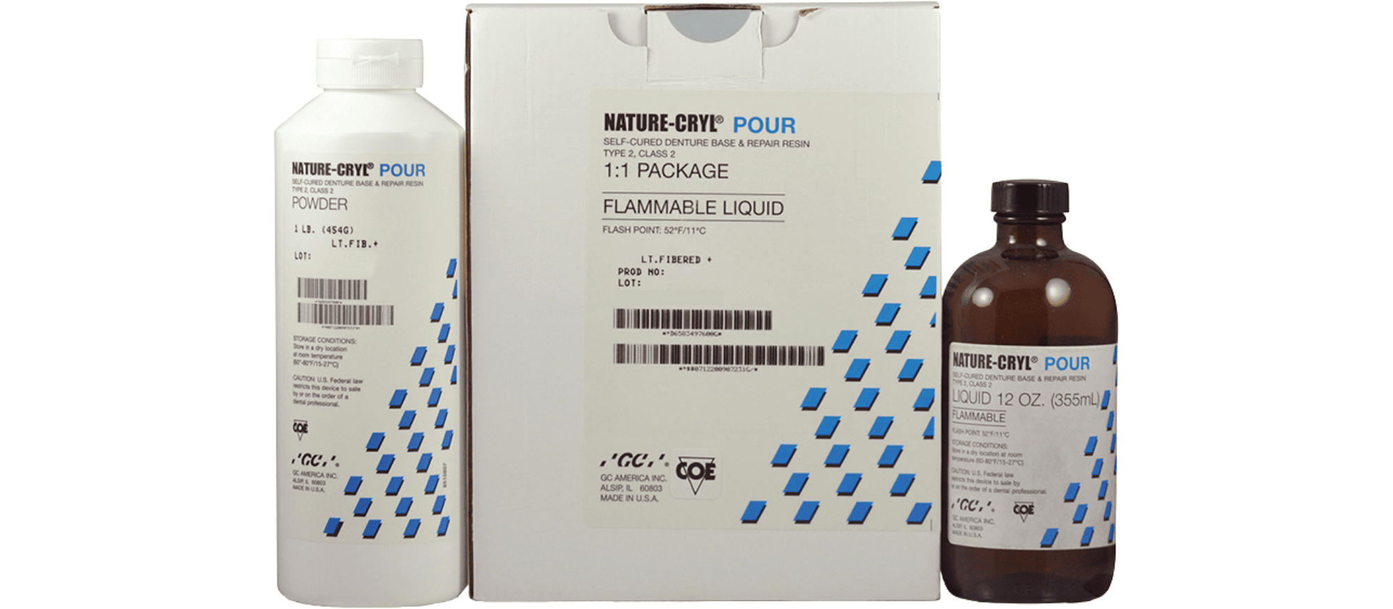 NATURE-CRYL® POUR is a POUR-type, acrylic resin used to process complete or partial dentures. This product can also be used as a laboratory reline and repair material. NATURE-CRYL® POUR is quite versatile; it can be used in many techniques including fluid resin, invest with hydrocolloid or alginate, cured with curing units and can be used in the fabrication of orthodontic appliances, splints and mouth guards.