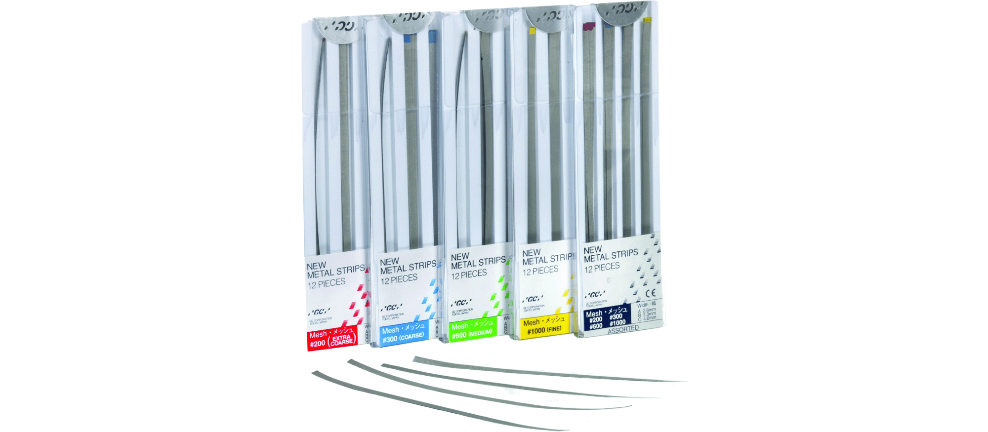GC NEW Metal Strips are sterilizable and autoclavable. They are color coded in 4 grits: coarse, medium, fine and extra fine - and are available in 3 width: 2.6mm, 3.3mm and 4.0mm.