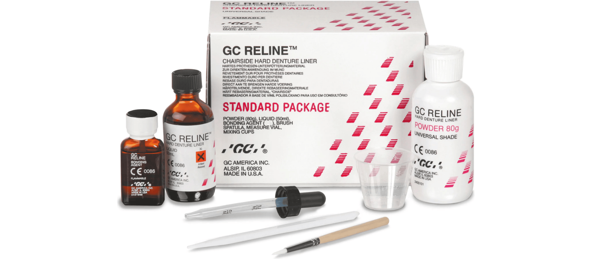 GC Reline™ is an improved methyl methacrylate-free, self-curing reline material that does not exhibit the high exothermic heat and pungent odor present in other acrylic, resin Reliners.