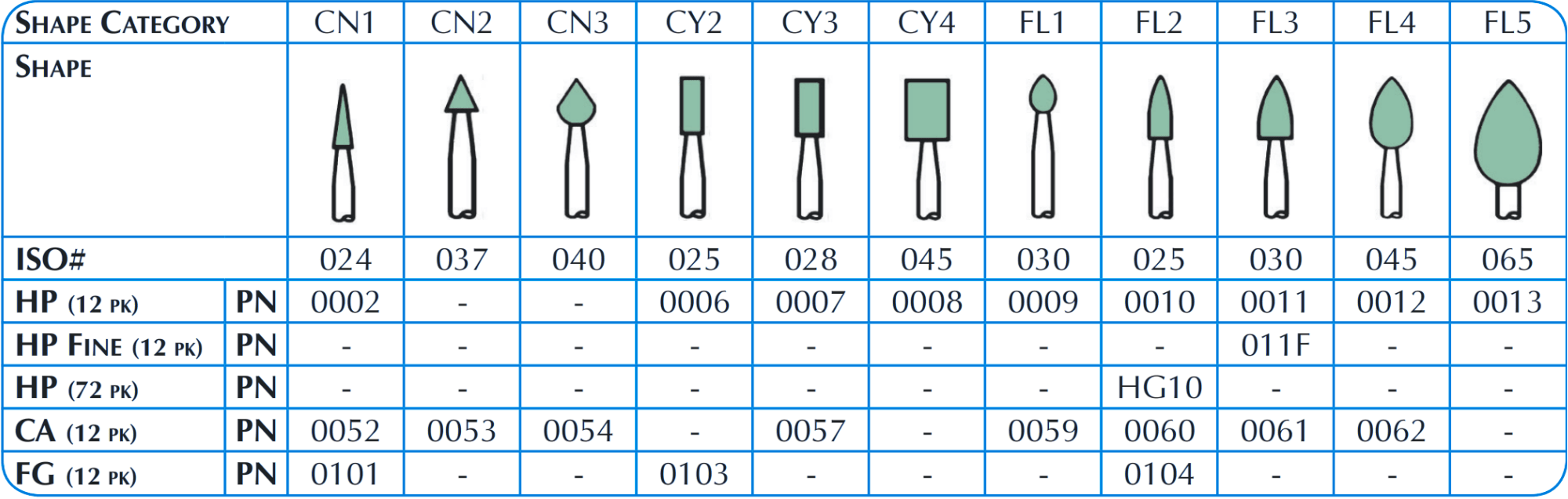 • Available in a variety of shapes in HP and CA shanks and selected number of shapes in FG shank