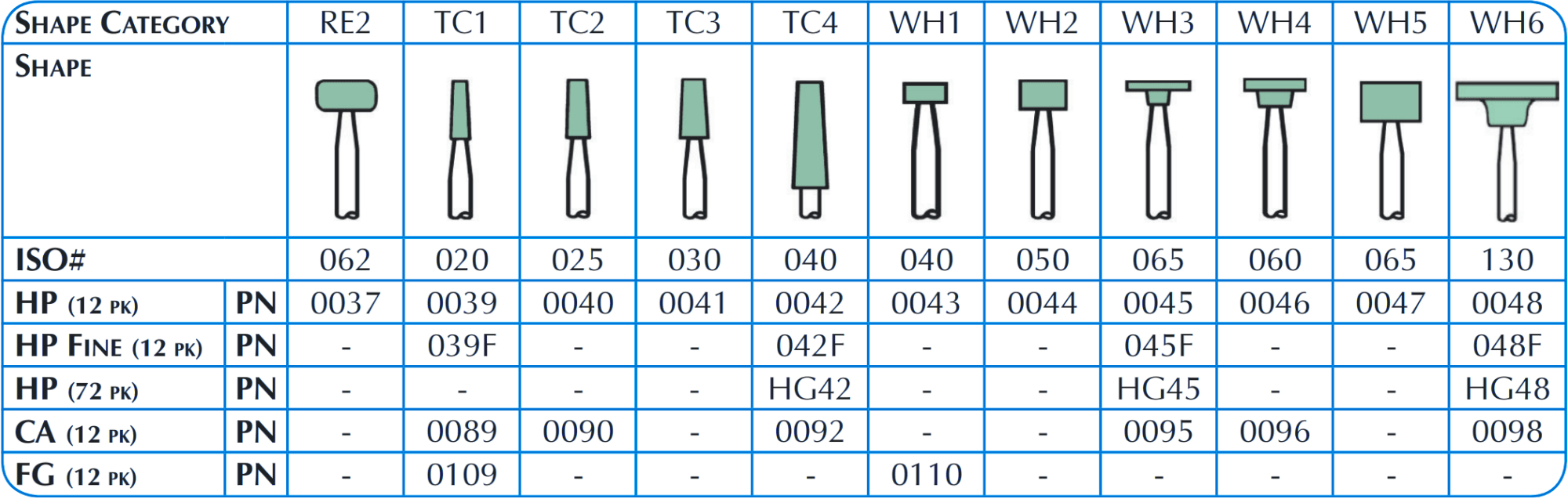 • Available in a variety of shapes in HP and CA shanks and selected number of shapes in FG shank