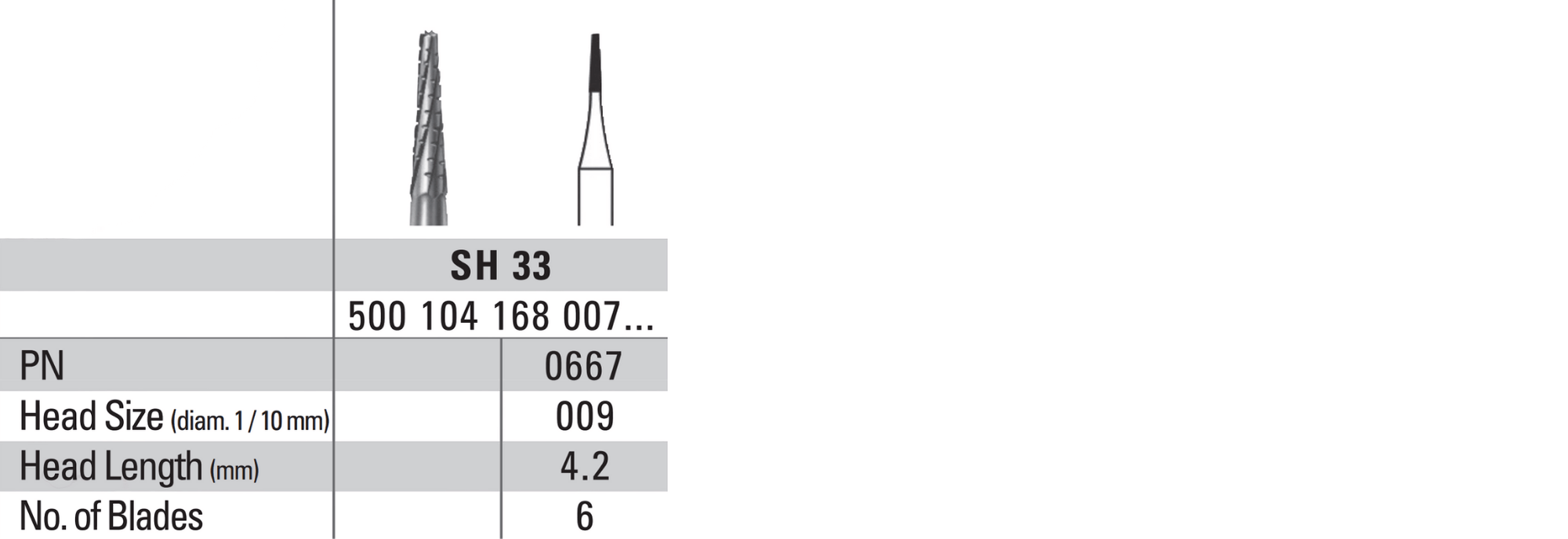 SHOFU Robot Carbide HP Fissure Burs - SH 33 (#Blades: 6) (Head Length: 4.2mm) (Head Size: 009mm) (Max Rpm: 50,000) - #0667 SHOFU Robot Carbide HP Fissure Burs - SH 33 (#Blades: 6) (Head Length: 4.2mm) (Head Size: 009mm) (Max Rpm: 50,000) - #0667