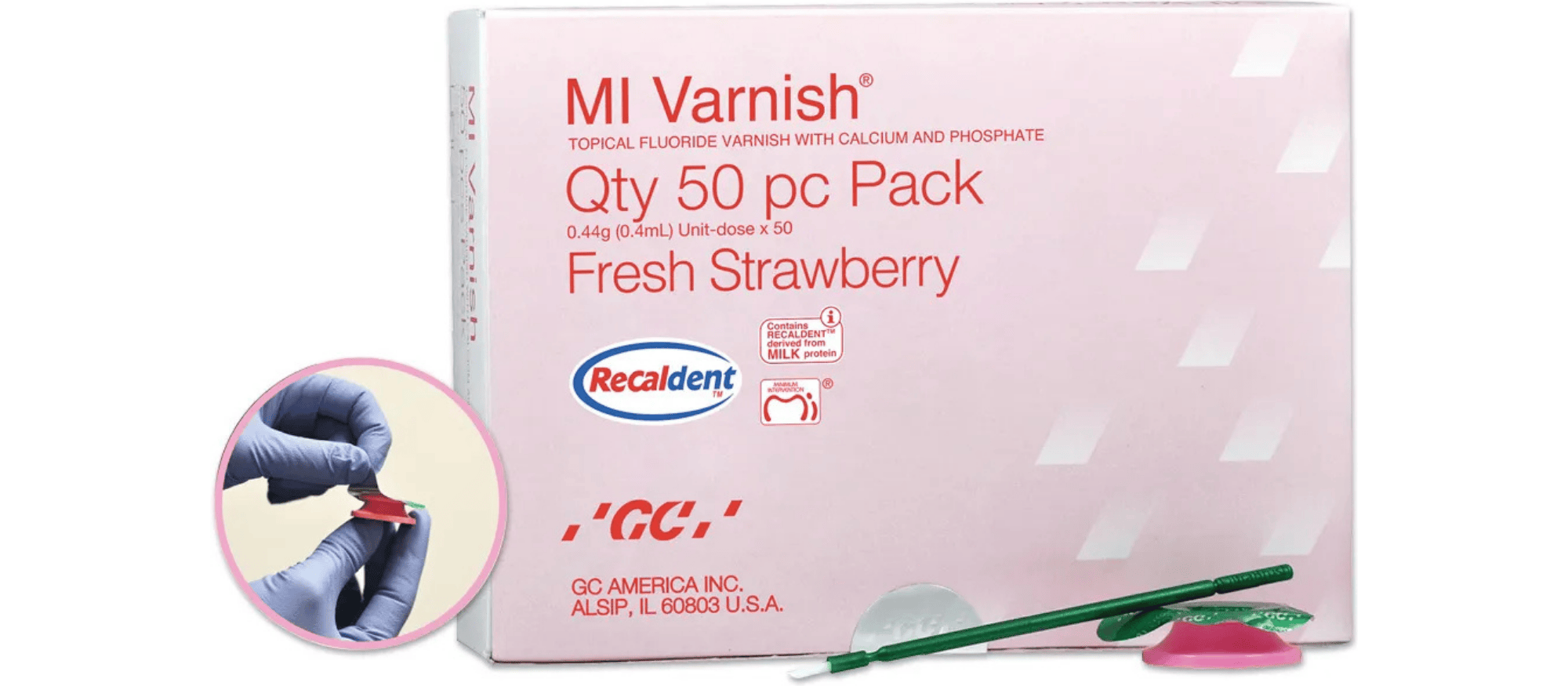 GC MI Varnish® Fresh Strawberry - Contains: 50 unit-doses (0.44 g; 0.4 mL each) and 50 disposable green applicators. - # 442500