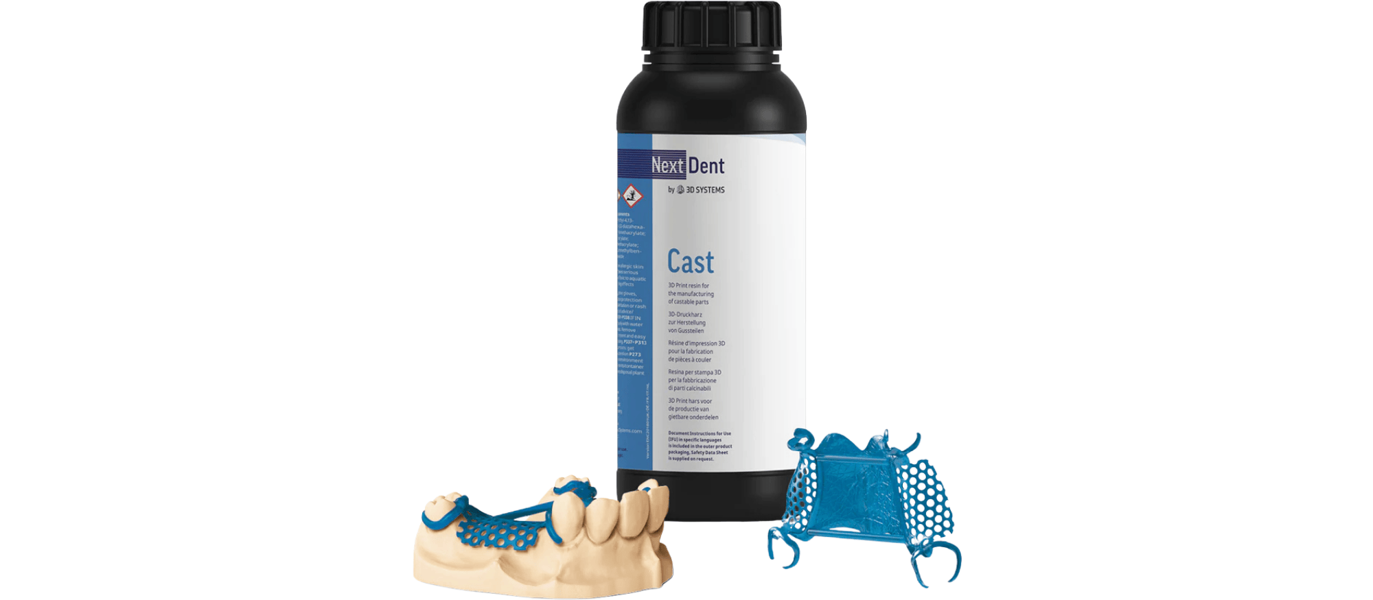 Our new NextDent Cast is an improved easy burn out 3D printing material, residue-free and suited for all kinds of purposes like a support structure, frame or orthodontic devices. The new Cast offers higher elongation and improved combustion and printability resulting in enhanced stability.