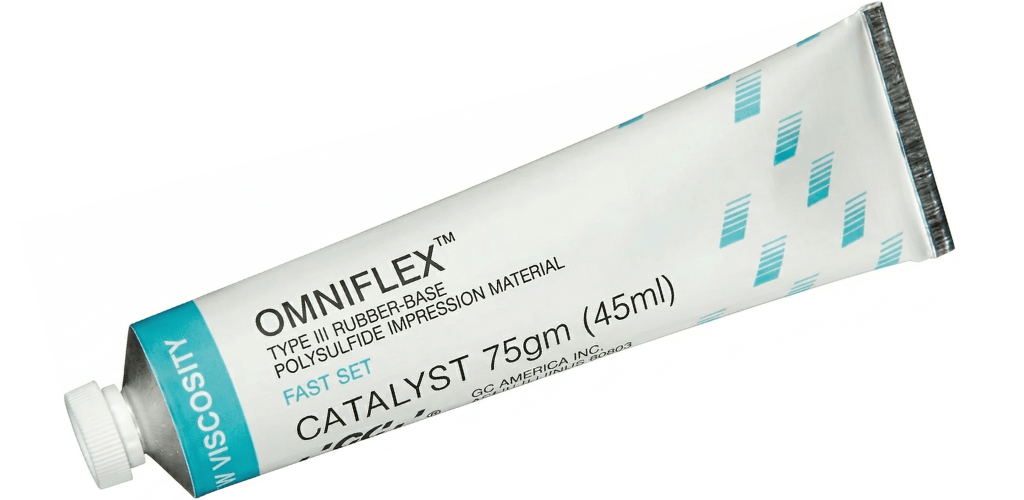 Omniflex™ is available in a mint flavor with two setting time, Regular (3 1/2 minute work time and 4 minute set) and Fast (2 1/2 minute work time and 3 minute set). It features high elasticity, a blue-green color, excellent tear strength and a patented, copper catalyst system.