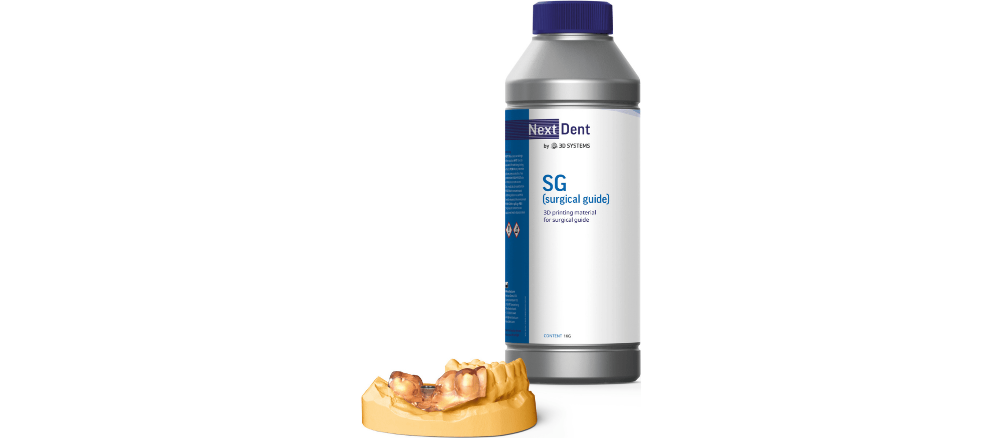 NEXTDENT SG is a biocompatible Class I material, developed for the printing of SurgicalGUIDES for implant surgery use. Because of the high precision of this material it is easy to insert drill sleeves, directly after printing. Enabling even greater precision during surgery. The properties of NEXTDENT SG will not change by using disinfectants.